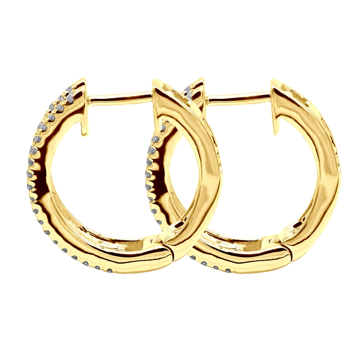 14K gold natural blue sapphire and white diamonds huggies earrings also called small hoop earrings, by LUXURMAN feature a row of channel set round cut blue sapphires within two rows of pave set sparkling round white diamond creating a stunning effect. These gorgeous ladies diamond and sapphire earrings are 4mm wide and about about 15mm long. Featuring a classic huggies design and a highly polished gold finish these sapphire and diamond earrings are available in 14k white gold, yellow gold and rose gold. Total carat weight of diamonds and blue sapphires is a full carat. Matching sapphire and diamond ring and bracelet are available below.