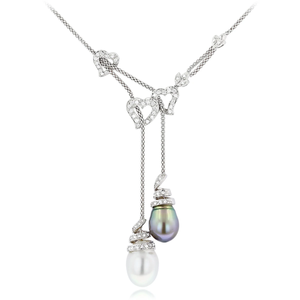This magnificent 18K Gold Pearl and Diamond Necklace with hearts features 2 gorgeous 13.5mm south sea pearls and 0.84 ctw of accentuating round diamonds of high VS clarity. Featuring a luxurious design and a highly polished gold finish, this fabulous women’s pearl and diamond heart necklace from our designer diamond jewelry collection weighs approximately 17 grams and is available in 18K white, yellow and pink gold.