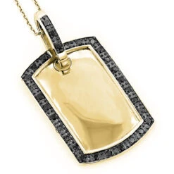 Gold Diamond Dog Tag Jewelry! This Small 14K Gold Black Diamond Dog Tag Pendant weighs approximately 9 grams and showcases 0.8 carats of prong-set round diamonds. Featuring a versatile design and a highly polished gold finish, this unisex diamond dog tag pendant is available in 14K white, yellow and rose gold, and can be custom made with any color fancy color diamonds. This black diamond dog tag pendant can also be engraved (back and/or front). You also can personalize this piece or check we’ve already made and create your own design.