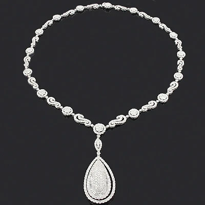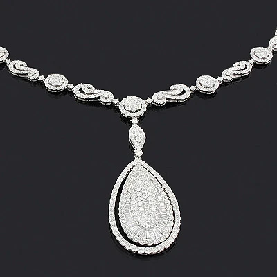 Exquisite Luccello Designer Jewelry: This Ladies Diamond Drop Necklace in 18K gold weighs approximately 29 grams and showcases 18.40 carats of dazzling round and baguette diamonds. Featuring an intricate design and a highly polished gold finish, this luxurious ladies diamond necklace is available in 18K white, yellow and rose gold.