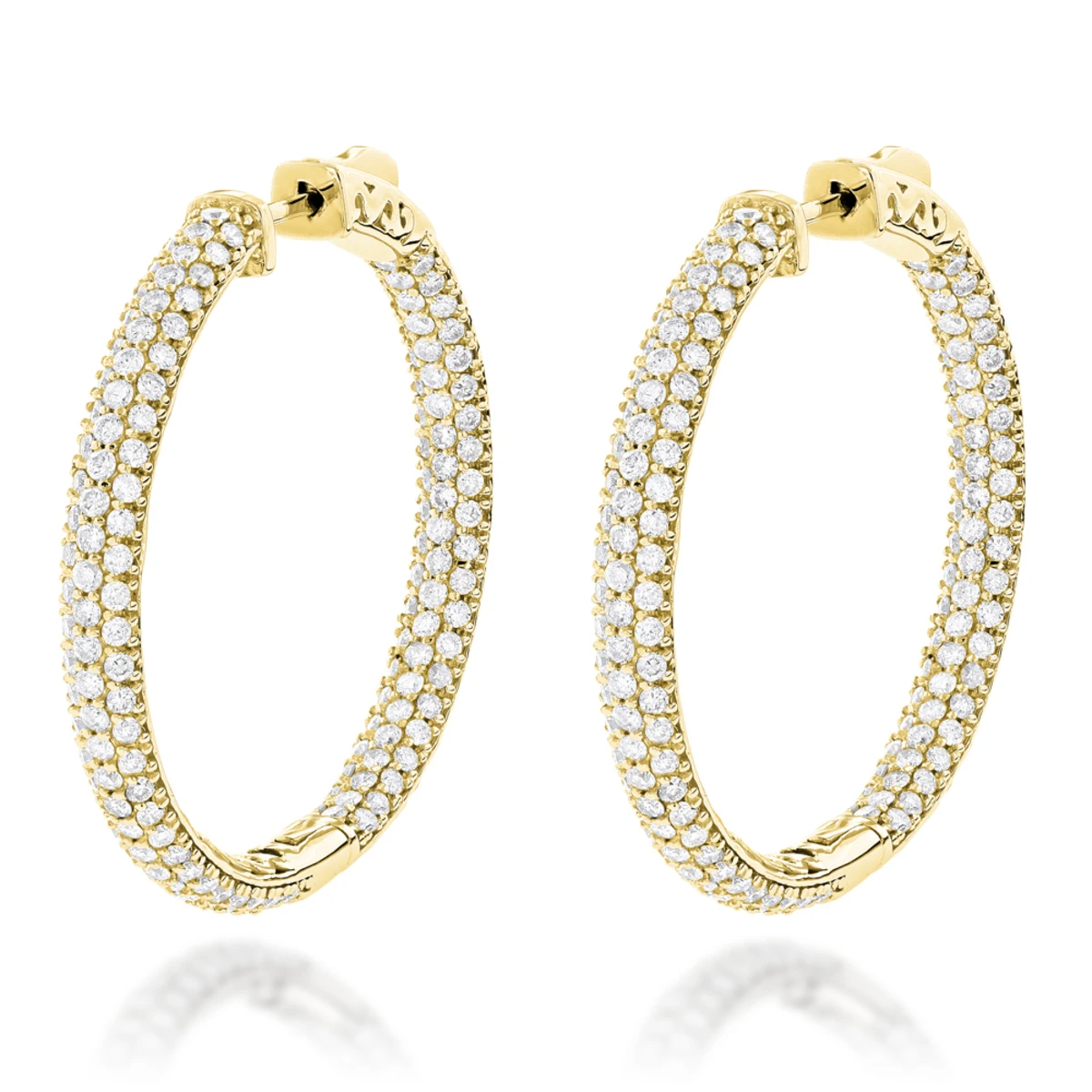 These Large 14K Gold Inside Out Diamond Hoop Earrings weigh approximately 12 grams and showcase 4.6 carats of sparkling pave-set diamond. Featuring a luxurious inside out design and a highly polished gold finish, these fabulous diamond hoop earrings come with unique, secure lock clasps so that you never have to worry about losing your diamond hoops again. These magnificent diamond hoop earrings are available in 14K white, yellow and rose gold, and can be manufactured on per order basis with a combination of any fancy color diamonds (canary yellow, fancy blue, black, chocolate, pink, green, red, and cognac diamonds).