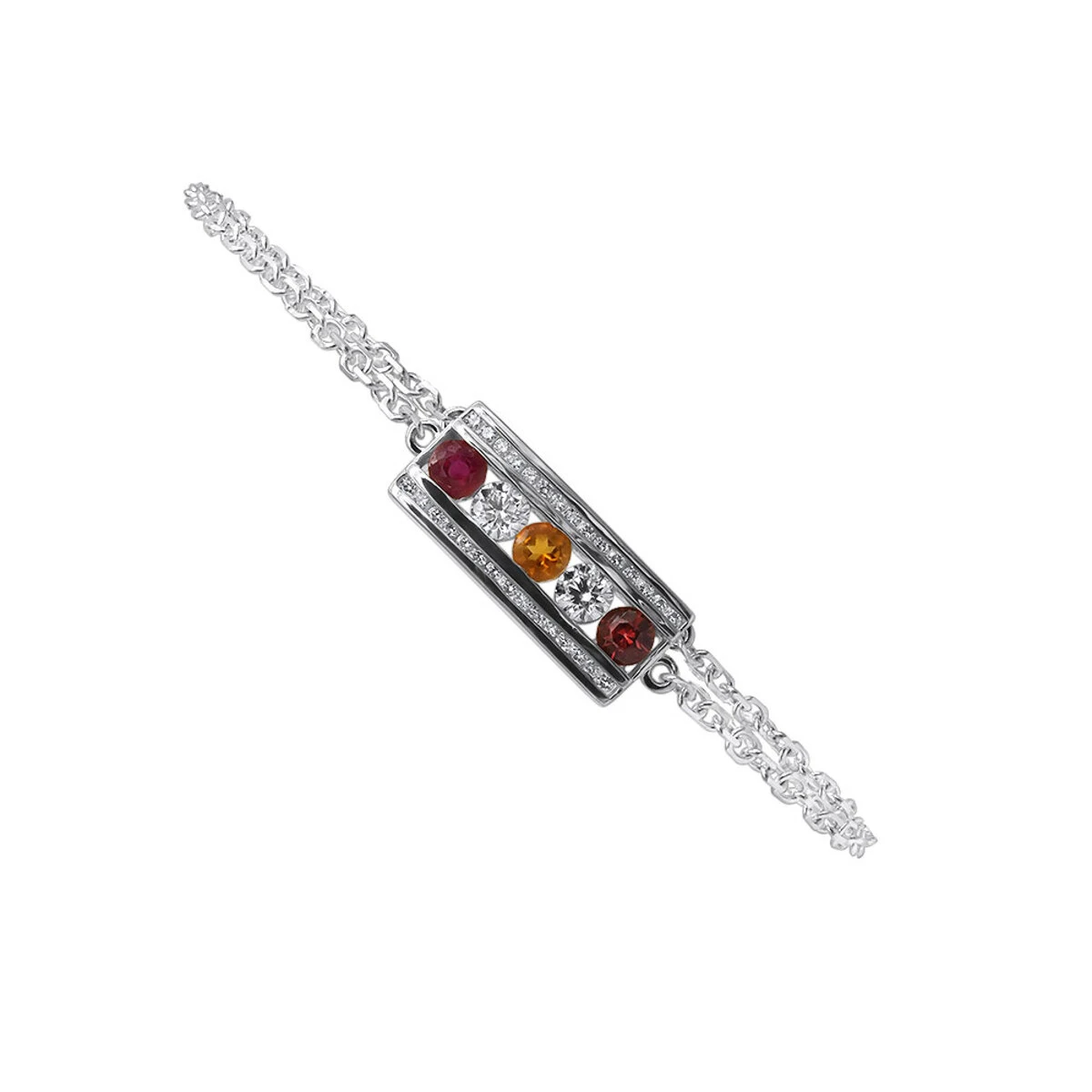 From our ladies diamond bracelets collection This alluring and very unique 14k Gold Gemstone and Diamond 1.75ct Bracelet for Women showcases a golden bar encrusted with white round diamonds of different sizes and fantastic colorful gemstones of 3 heart-warming hues – cherry red ruby, ocher citrine and scarlet garnet. The glowing composition is held by a solid golden chain which has a secure lobster lock on the back. The bracelet 7 1/2 inches long and 3/8 inch (9mm) wide. This unique diamond and gemstone bracelet demonstrates us the unique beauty of different precious stones, creating a captivating contrast of color. It is available in all gold colors of your choice – yellow, white and rose in 14k gold or 18k gold option. Please contact us for different length options.